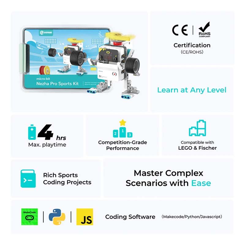 Nezha Pro Sporto rinkinys – tai sporto tematikos STEAM edukacinė priemonė pradinių ir vidurinių mokyklų mokiniams. Rinkinys paremtas galingu Nezha Pro valdikliu ir Planet X jutiklių serija, kuriame yra keturi linijų sekimo jutikliai, ultragarso jutiklis, susidūrimo jutikliai ir kt. Komplektas tinka įvairaus lygio mokiniams, leidžia patirti kūrybos džiaugsmą per programavimą ir elektroniką. Palaikomas valdiklio neveikimo režimas, todėl vaikai gali atlikti pagrindinius projektus net neturėdami programavimo žinių. Rinkinyje daugiau nei 20 praktinių užduočių ir beveik 600 blokų, kurie padeda ugdyti praktinius įgūdžius, loginį mąstymą bei skatina kūrybiškumą.