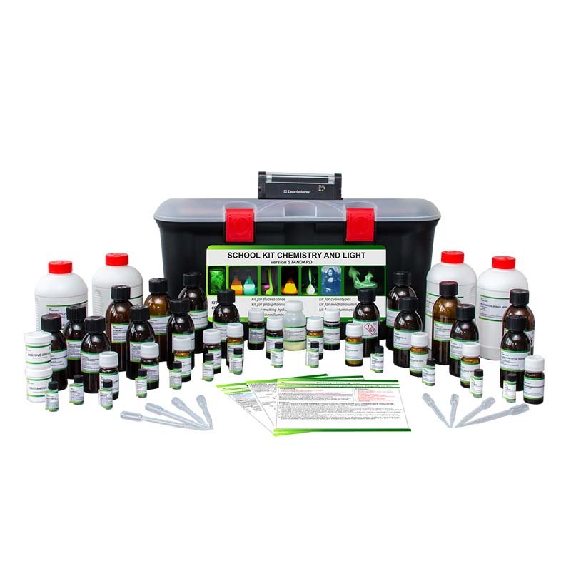 Saugūs, įdomūs švytėjimo ir fotochemijos eksperimentai. Įtrauktos cheminės medžiagos, skirtos gyviems, praktiniams bandymams.